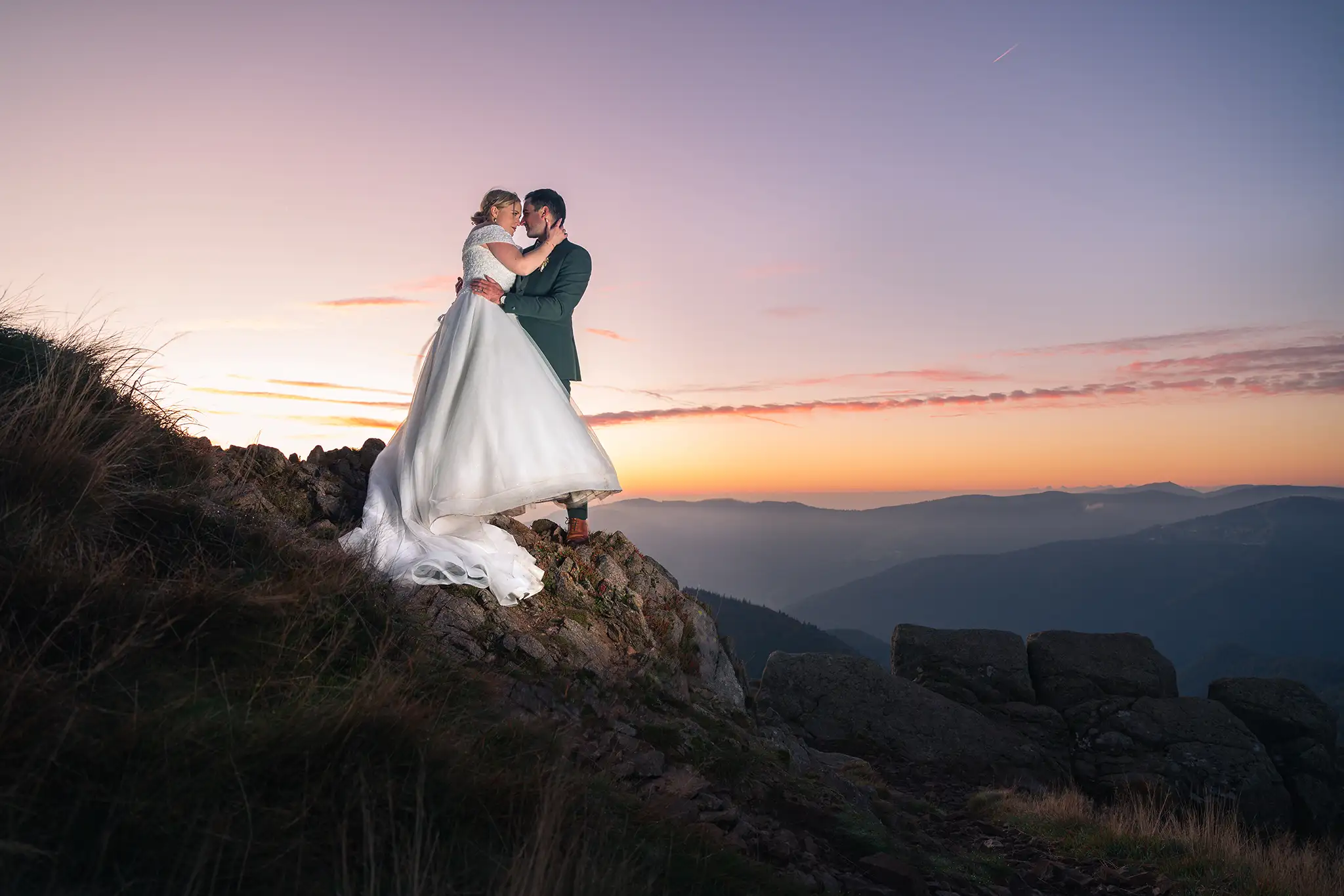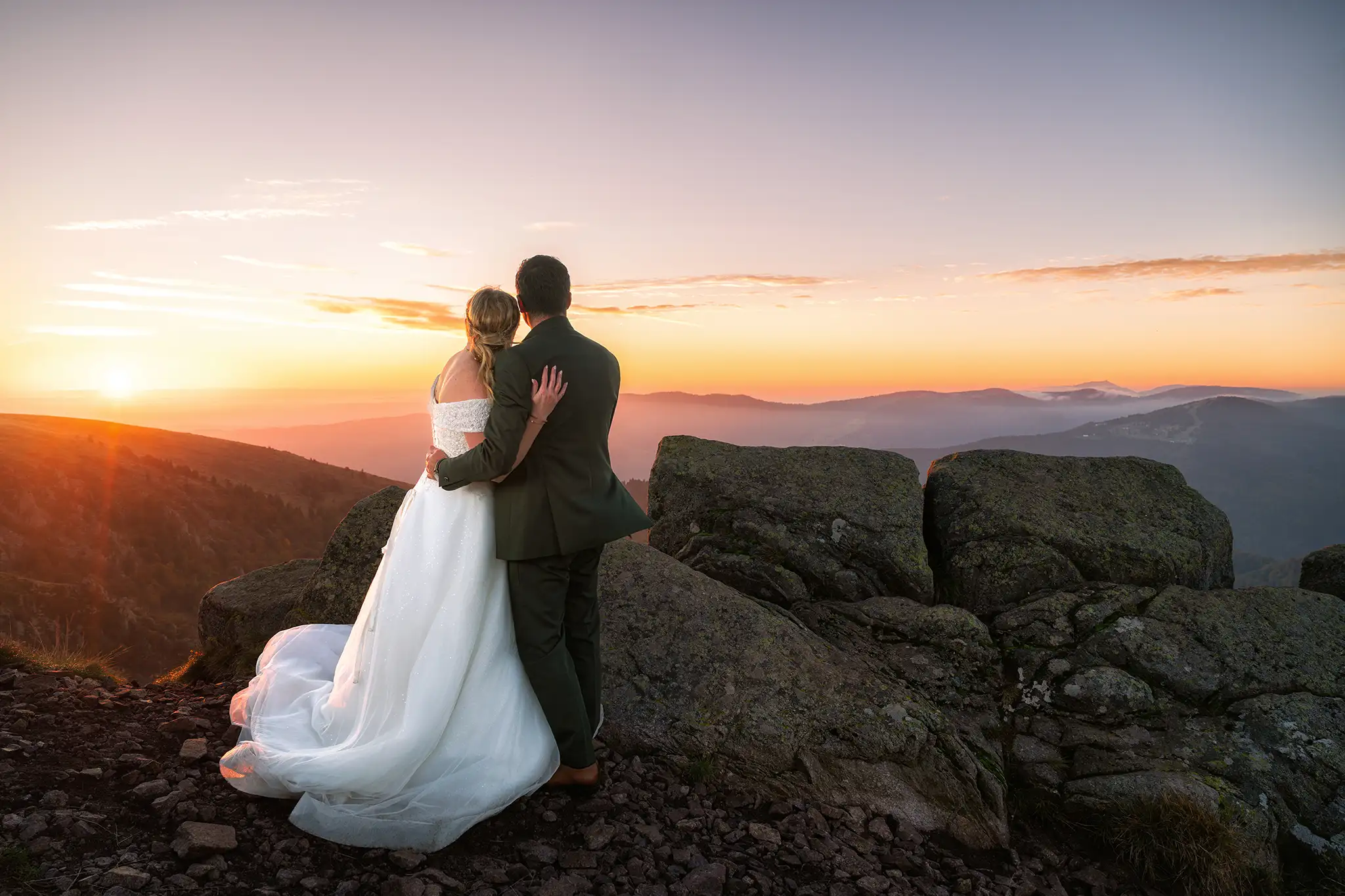 Il est 6h du matin. L’air pique un peu les joues, le thermomètre affiche un timide 6 degrés et le silence est total. Seuls le vent, quelques chamois curieux, et le bruit de nos chaussures viennent troubler la quiétude du Hohneck. C’est ici, au sommet des Vosges, que Boris et Alicia ont décidé de prolonger leur histoire d’été suite à leur mariage, avec une séance day after… aussi fraiche que magique.