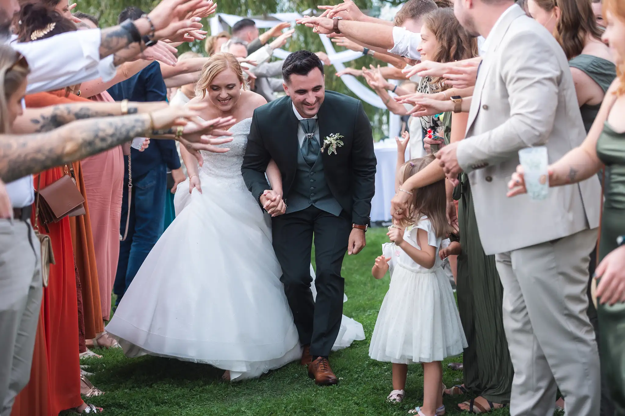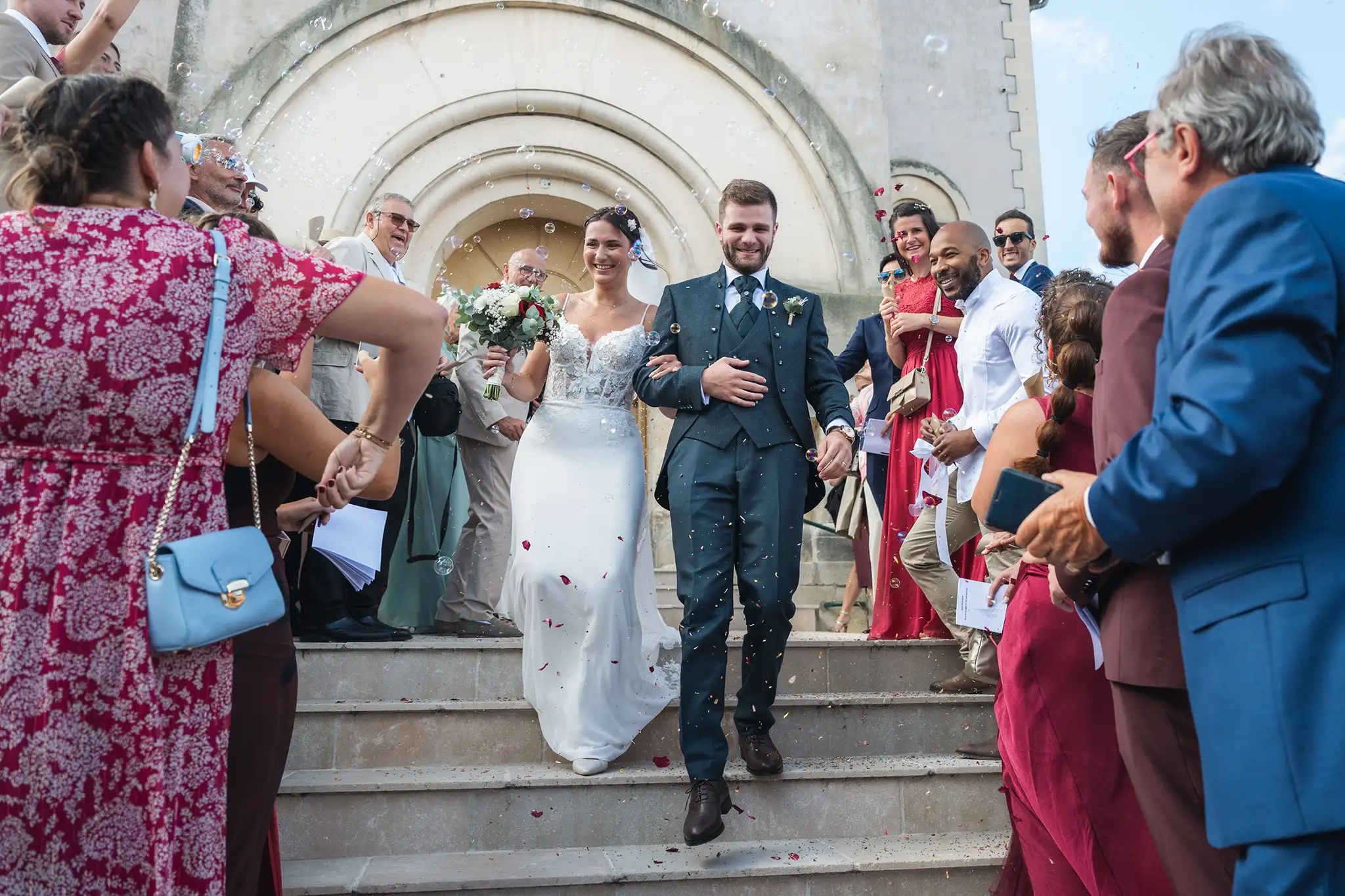 💡 Astuce de photographe : placez quelques invités de chaque côté de l’allée avec des pistolets à bulles. Les mariés avancent au centre, enveloppés d’une pluie légère de bulles, le tout dans une belle lumière naturelle. Magique !